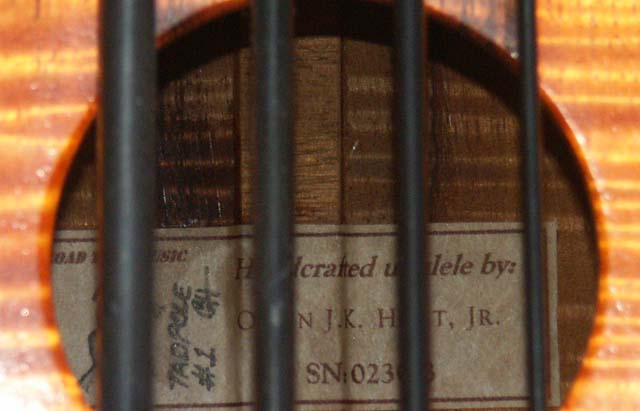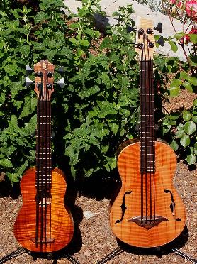 | Completed 4/27/07, this is the first of the Tadpole series of short scale concert ukulele sized basses. The playing scale is 18" and this particular instrument weighs 1lb 9oz and is 24.7" in length. Additional specs: |