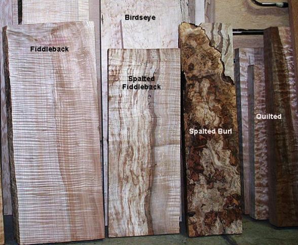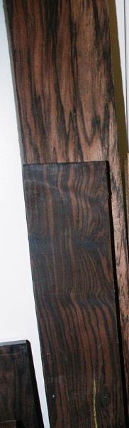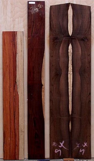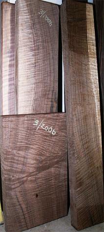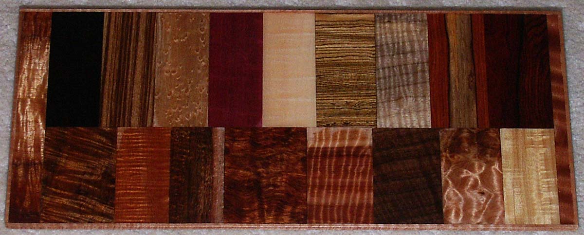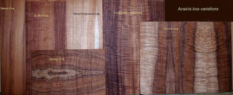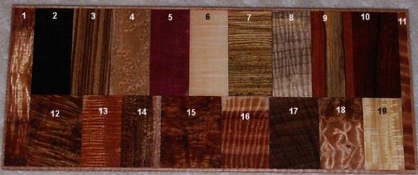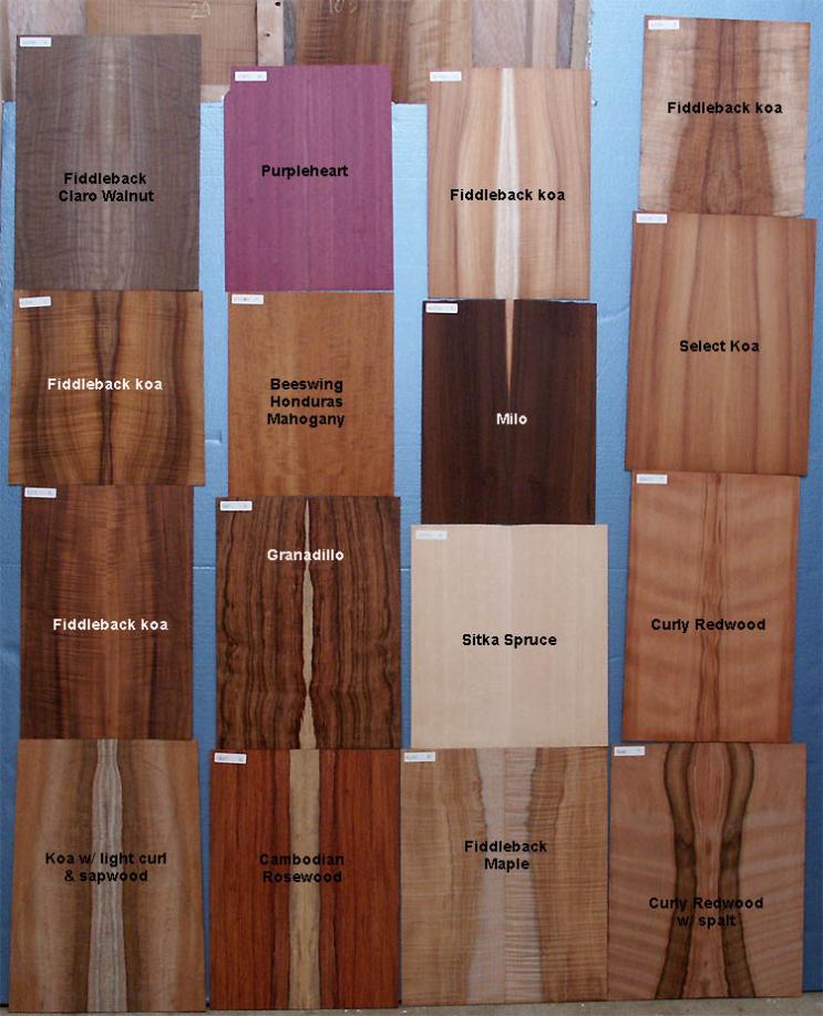There are many different woods used in instrument construction. Medium density hardwoods such as koa, mahogany, walnut, mango and primavera an be used for the entire instrument body. Denser woods such as the rosewoods, macassar and purpleheart should only be used for the back and sides with a tonewood selected for the top. For tonewoods, spruce is the most common, but cedar and redwood are often used with great results. For Soprano and Concert 'ukuleles, I prefer to go with one of the medium density woods all the way around. For Tenor, I would go either way. For Baritone, I would use a tonewood top with a dense back to bring out the lower range of tuning. There's a wide range of species as you can see from the below pictures.